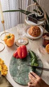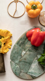 Every platter is created by setting multiple semi-precious stones together in epoxy to make them sturdy, durable and easy to clean.
